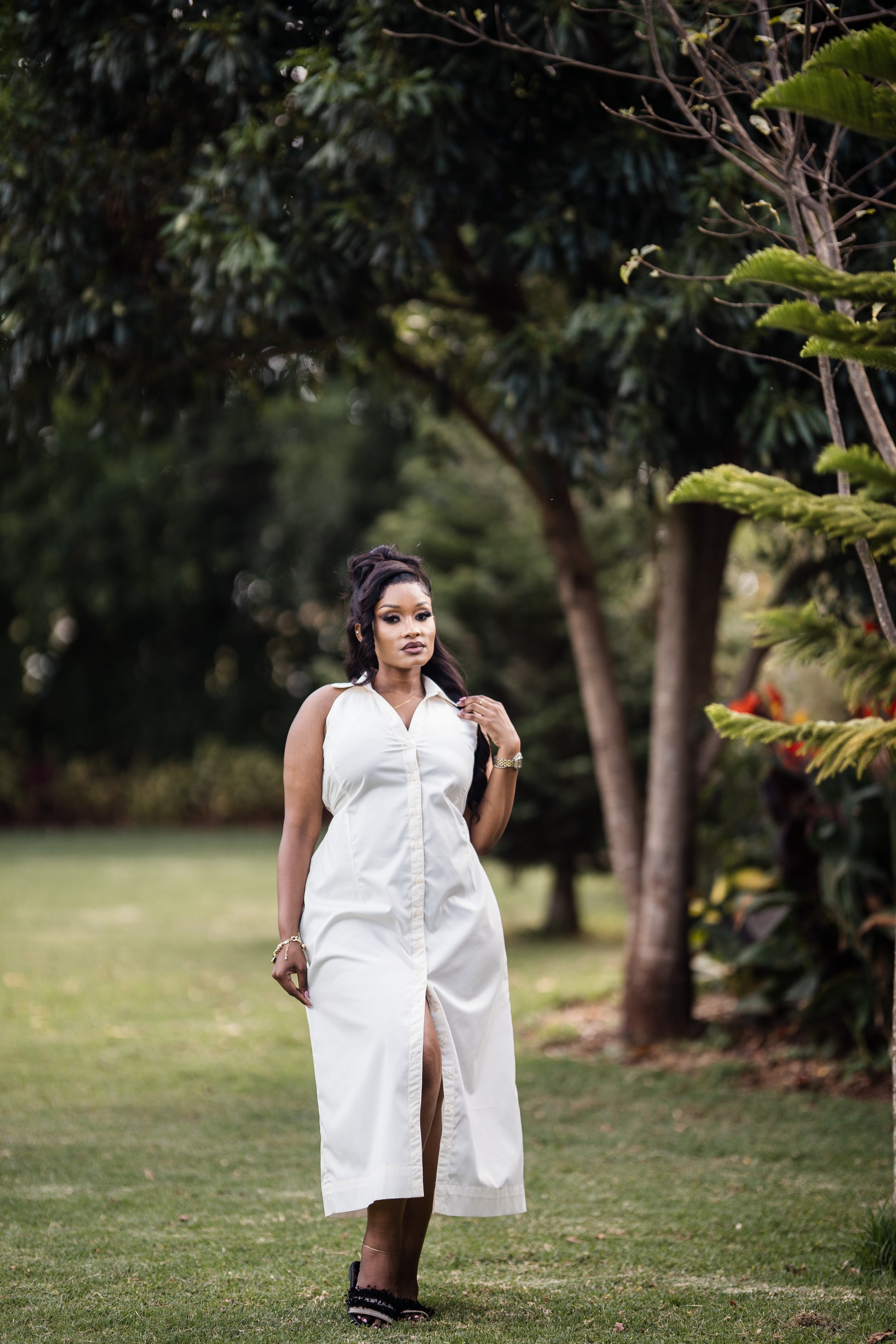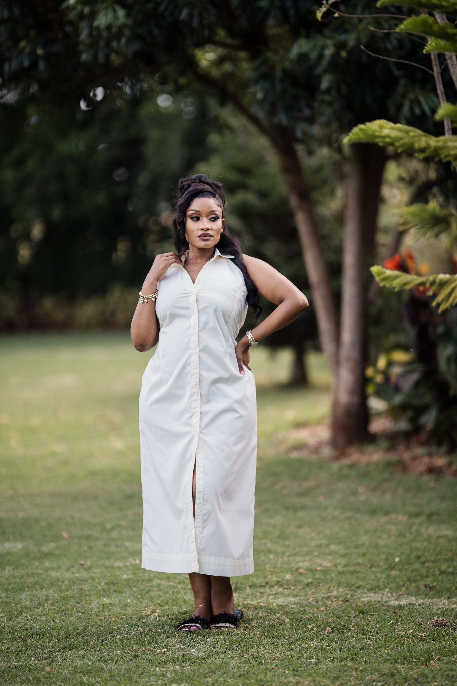 Kelsey takes the classic button-down and turns it into a sleek, easy midi dress. The structured collar keeps it sharp, while the relaxed, straight silhouette gives you comfort you can move in. The front slit adds just enough edge, balancing the simplicity with a hint of confidence.