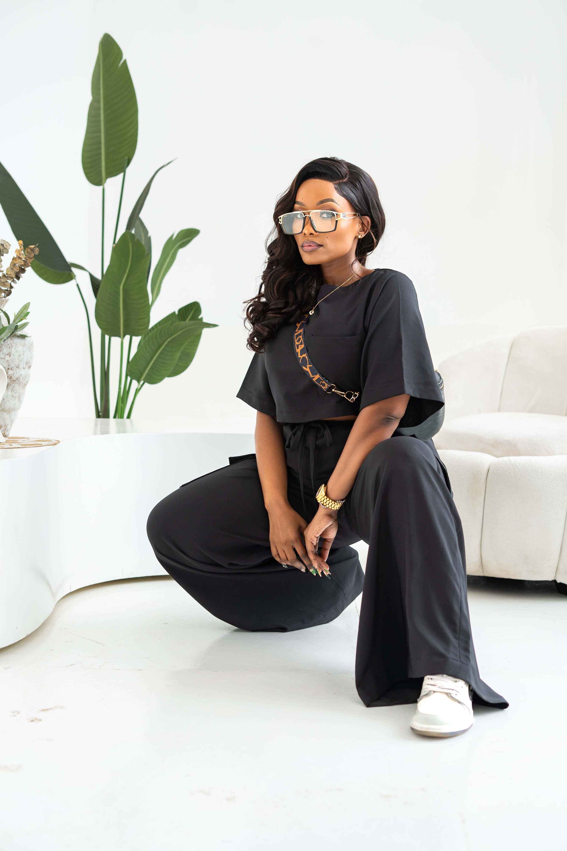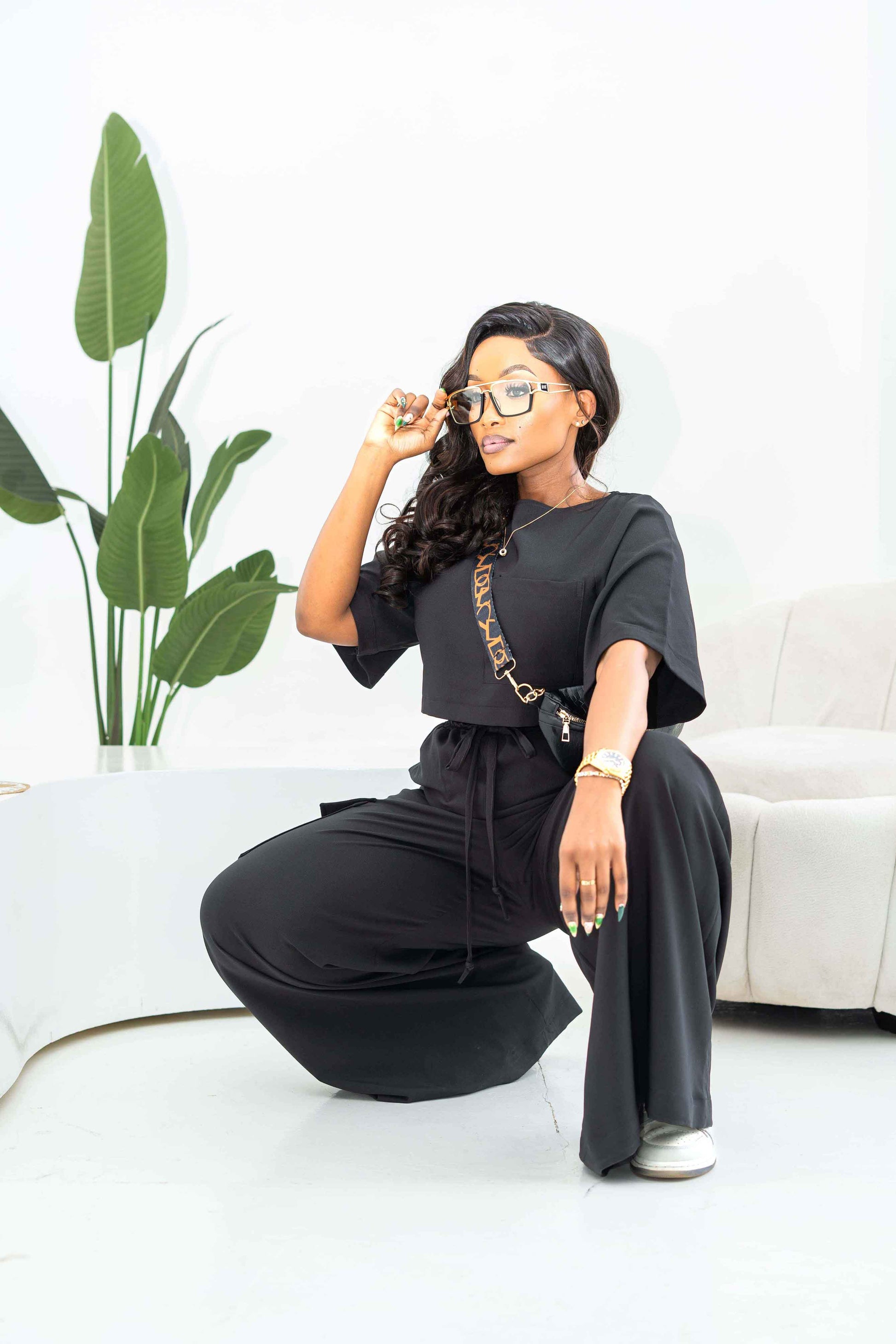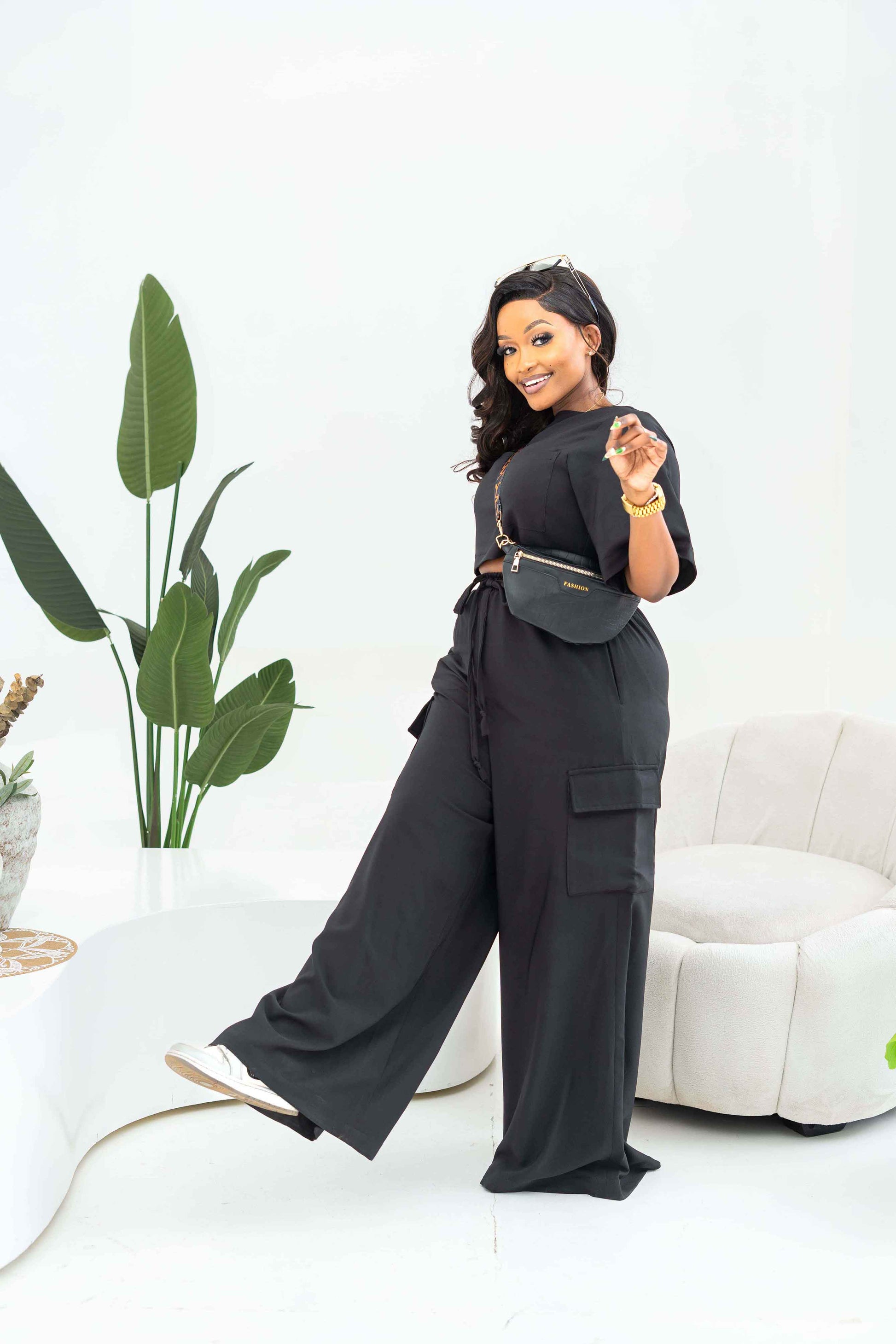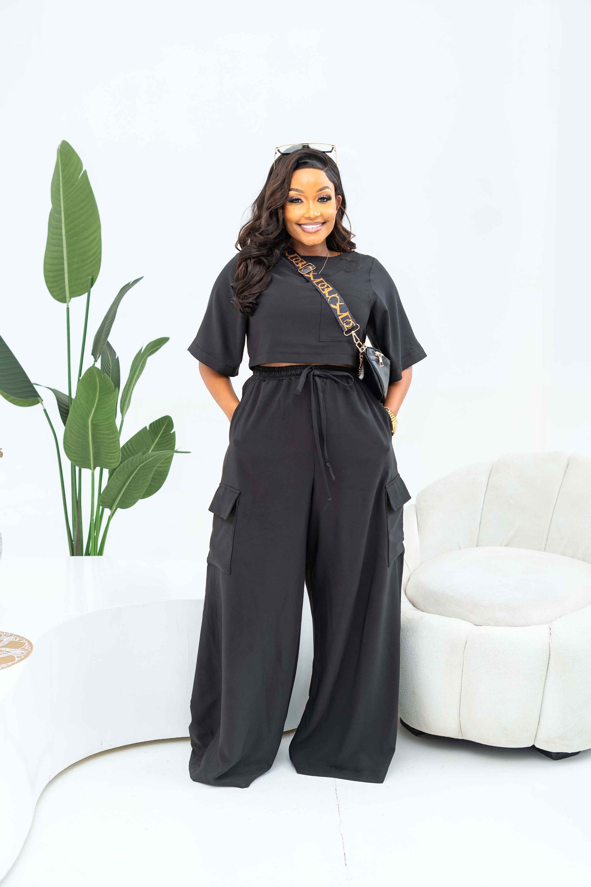 Meet your new go-to set for effortless style and all-day comfort. This black wide-leg utility piece blends a relaxed feel with a clean, modern look. The round neckline and soft short sleeves keep it simple, while the adjustable drawstring waist gives you the perfect fit every time. Wide, flowy legs create a beautiful drape, and the cargo pockets give it just the right amount of functional detail. Whether you're dressing it up or keeping things casual, this jumpsuit does it all without trying too hard.