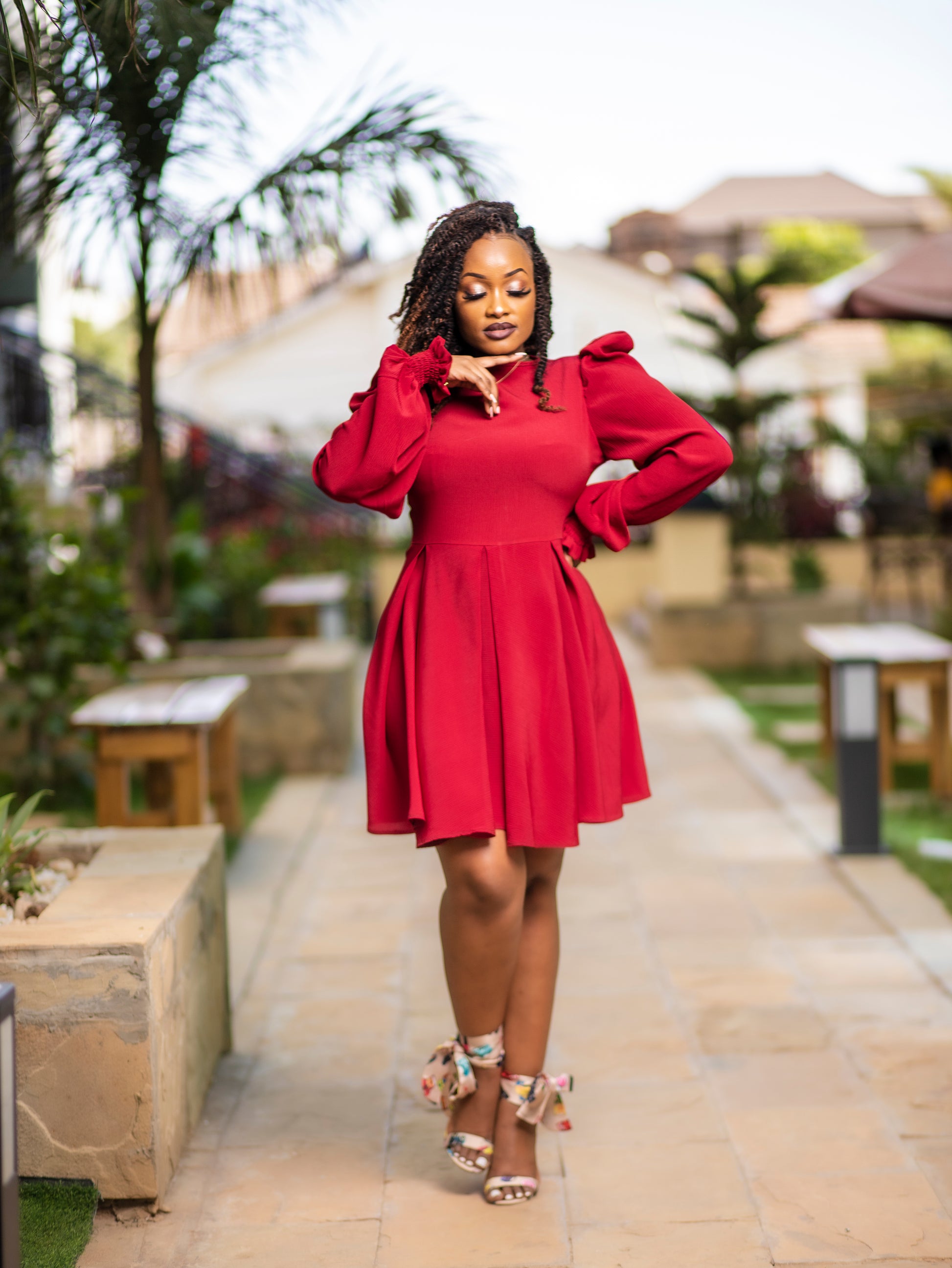 Victoria is designed to deliver elegance with a touch of drama. The fitted bodice creates a flattering shape, while the voluminous long sleeves and cinched waist add soft structure. The flared mini skirt moves beautifully, giving the dress a playful finish that works for brunches, dinners, events, or any moment you want to look effortlessly polished. With its rich red tone and timeless silhouette, Victoria is a standout piece made to turn heads.